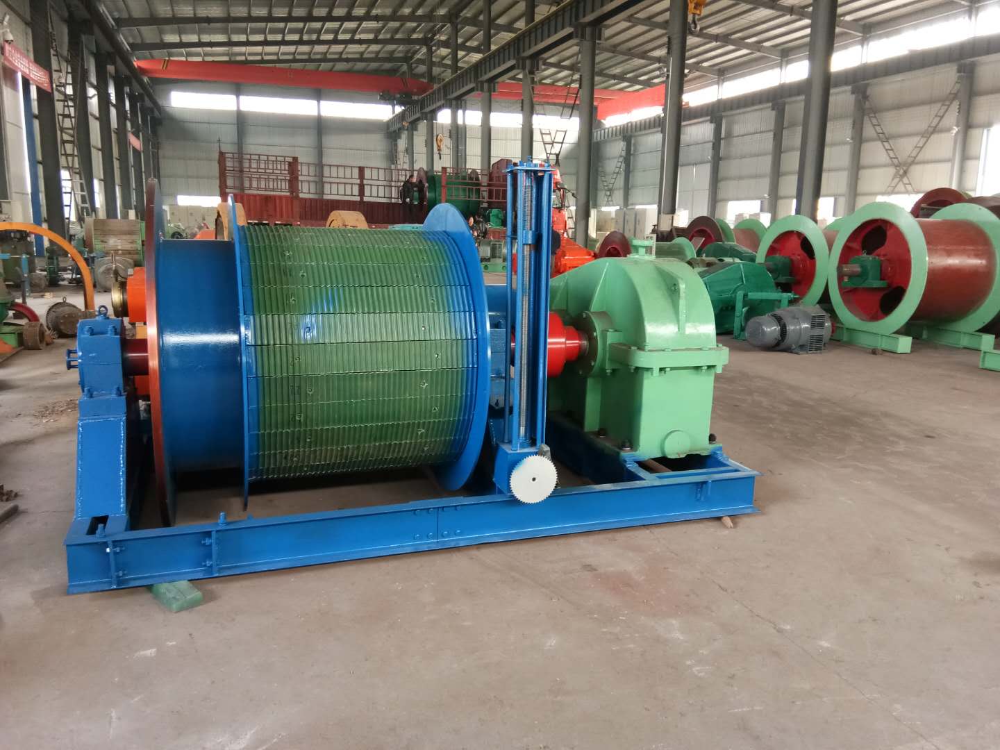 產(chǎn)品由動(dòng)力系統(tǒng)、傳動(dòng)系統(tǒng)、工作系統(tǒng)、制動(dòng)系統(tǒng)、控制操作系統(tǒng)、指示保護(hù)系統(tǒng)等及其附屬部分組成。它以電動(dòng)機(jī)動(dòng)力源,通過(guò)減速器、主軸裝置構(gòu)成了產(chǎn)品的傳動(dòng)系統(tǒng)和工作系統(tǒng)。由液壓站、制動(dòng)器裝置構(gòu)成了產(chǎn)品可靠的制動(dòng)系統(tǒng);由操作臺(tái)、電氣控制設(shè)備構(gòu)成了產(chǎn)品完備的控制操作系統(tǒng);由深度指示器、編碼器裝置等構(gòu)成了產(chǎn)品完善的指示、保護(hù)系統(tǒng)。